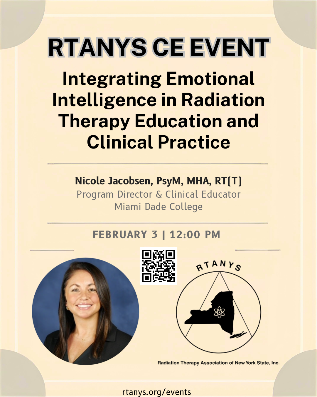 Radiation therapy professionals work at the intersection of advanced technology and deeply human experiences. Emotional intelligence (EI) plays a critical role in how radiation therapists communicate with patients, collaborate with colleagues, manage stress, and support learning environments. Please join us for a free virtual 1.0 CE lunch and learn titled “Integrating Emotional Intelligence in Radiation Therapy Education and Clinical Practice” on Tuesday, February 3rd @ 12:00.